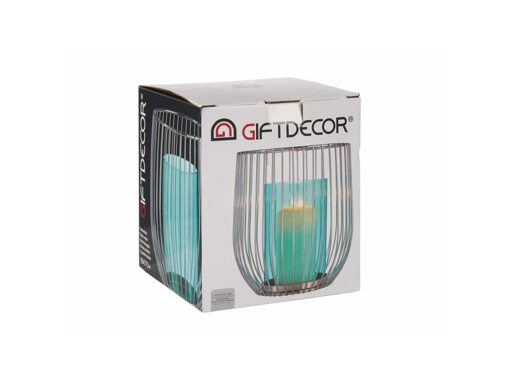 Gyertyatartó ezüstkék ketrec fémüveg (15 x 17 x 15 cm)