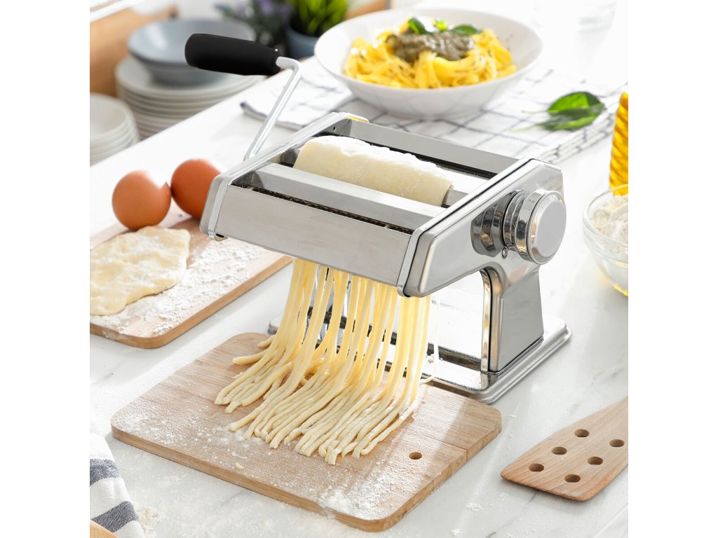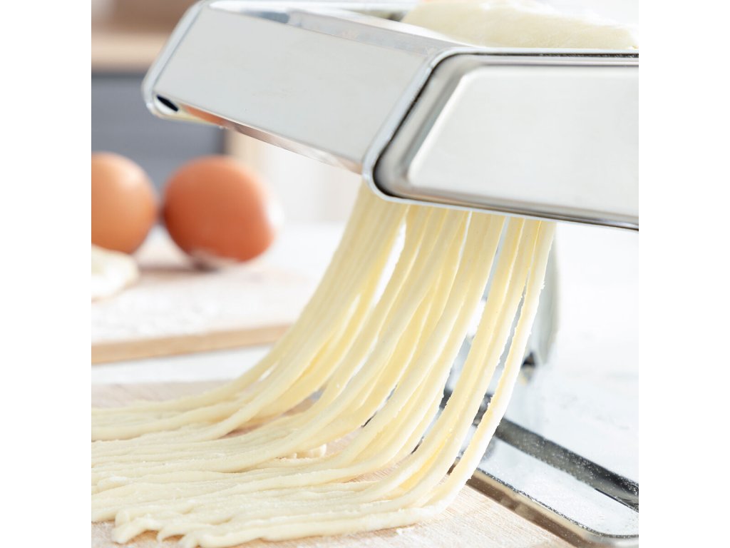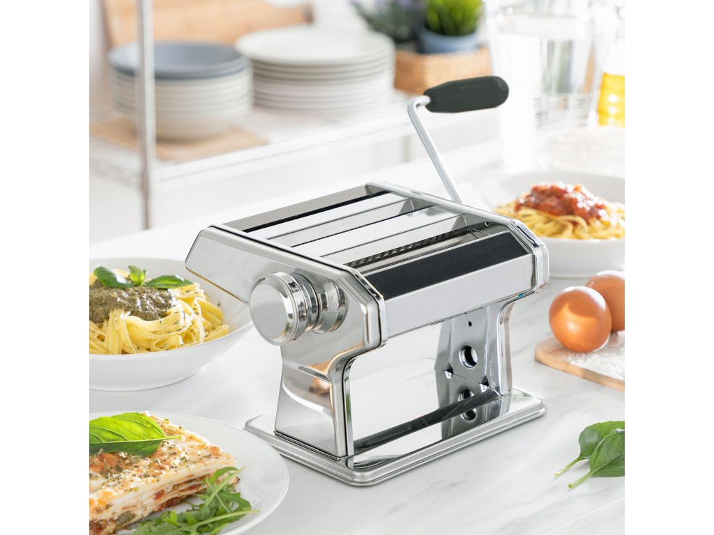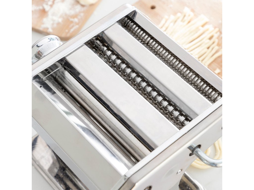 Gép friss házi tészta készítéséhez - családjával együtt ízletes tészták széles választékát élvezheti. Működése kézi és többfunkciós, mivel a tészta könnyű dagasztására, nyújtására és vágására szolgál. Kivehető fogantyúja nagyon könnyen össze- és szétszerelhető, így könnyen tárolható. Ez a sokoldalú konyhai gép 3 vágógörgővel rendelkezik 3 különböző tészta (spagetti, tészta és lasagna) elkészítéséhez. Beállíthatja a tészta vastagságát (8 fokozat). A szorítóbilincsnek és a csúszásgátló lábaknak köszönhetően a gép szilárdan rögzíthető az asztalhoz vagy a munkafelülethez. Recept útmutatót tartalmaz, tartós és nagyon könnyen használható. Könnyen tisztítható nedves ruhával.- Anyaga: fém