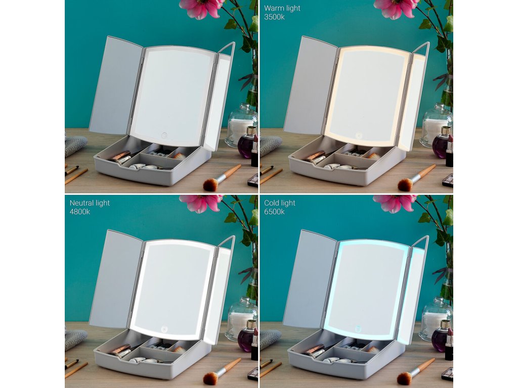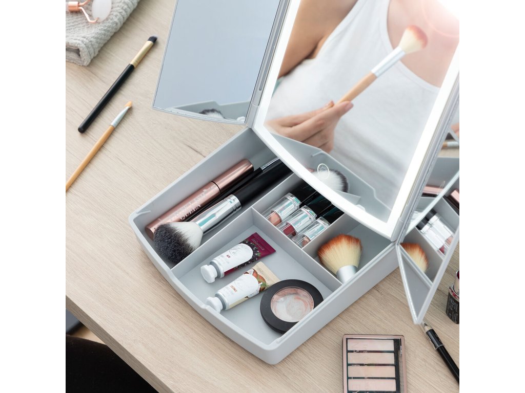 Eredeti összecsukható LED-es tükör sminkrendezővel (3 az 1-ben többcélú), ideális a kényelmes sminkeléshez, optimális láthatósággal. Modern összecsukható kialakítású, több tárolórekesszel rendelkezik a sminkeszközök és -termékek számára, így helyet takaríthat meg, és mindig megtalálható benne, amire szüksége van a smink egyszerű felviteléhez. Ezenkívül rendkívül sokoldalú és alkalmazkodóképes, USB-n keresztül (USB-micro USB-kábel mellékelve) vagy akkumulátorral működik (nem tartozék), attól függően, hogy éppen mit szeretne. Érintésvezérlésű LED lámpával és 3 fénybeállítással (hideg fény, meleg fény, nappali) rendelkezik. Ez a panorámás és hordozható asztali tükör egy központi tükörrel és két oldalsó tükörrel rendelkezik, melyek könnyen össze- és kihajthatók. A hátulján 7-szeres nagyítású mini elcsúsztatható tükör található, hogy kinagyított képet kapjon az arc kívánt területéről, valamint kis, csúszásmentes lábakkal rendelkezik a szilárd tartás érdekében.- Anyag:
