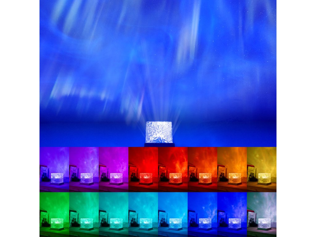 - Mozgó vetítés: ez az eredeti sokszínű LED lámpa mozgó fényhullámokat vetít ki aurora hatással, hasonlóan az elbűvölő aurora borealis visszaverődéséhez. Ideális varázslatos lefekvés előtti hangulat megteremtéséhez a ház bármely helyiségében, szimulálva ezeket a lenyűgöző természeti jelenségeket.