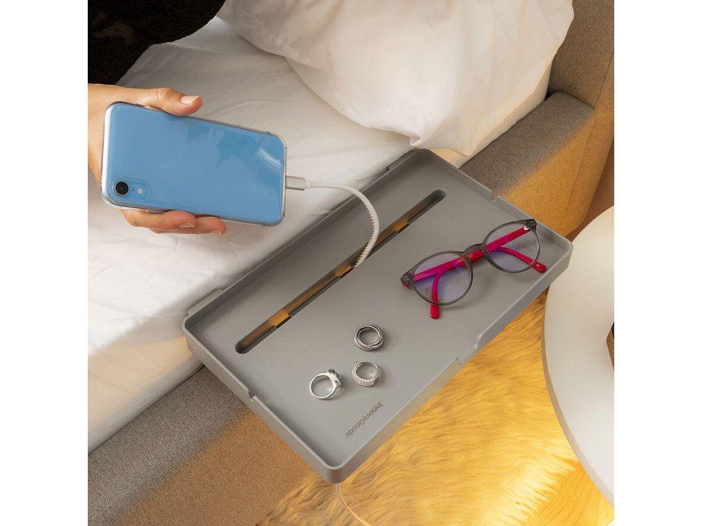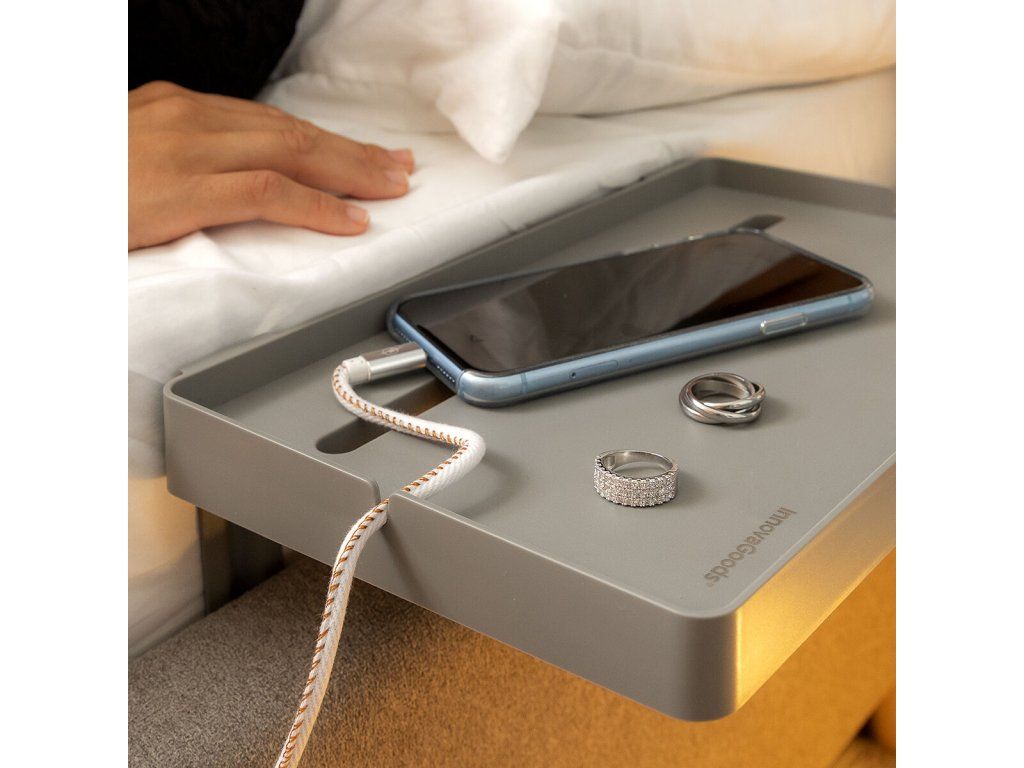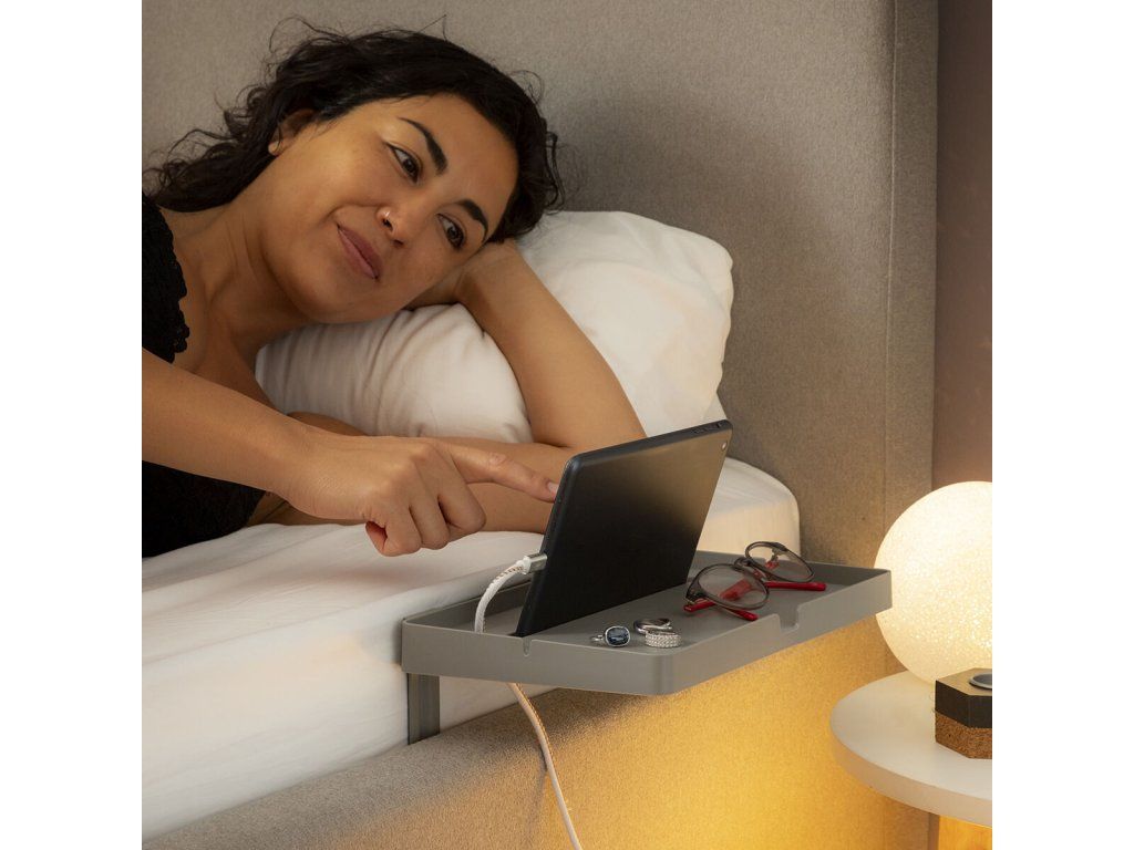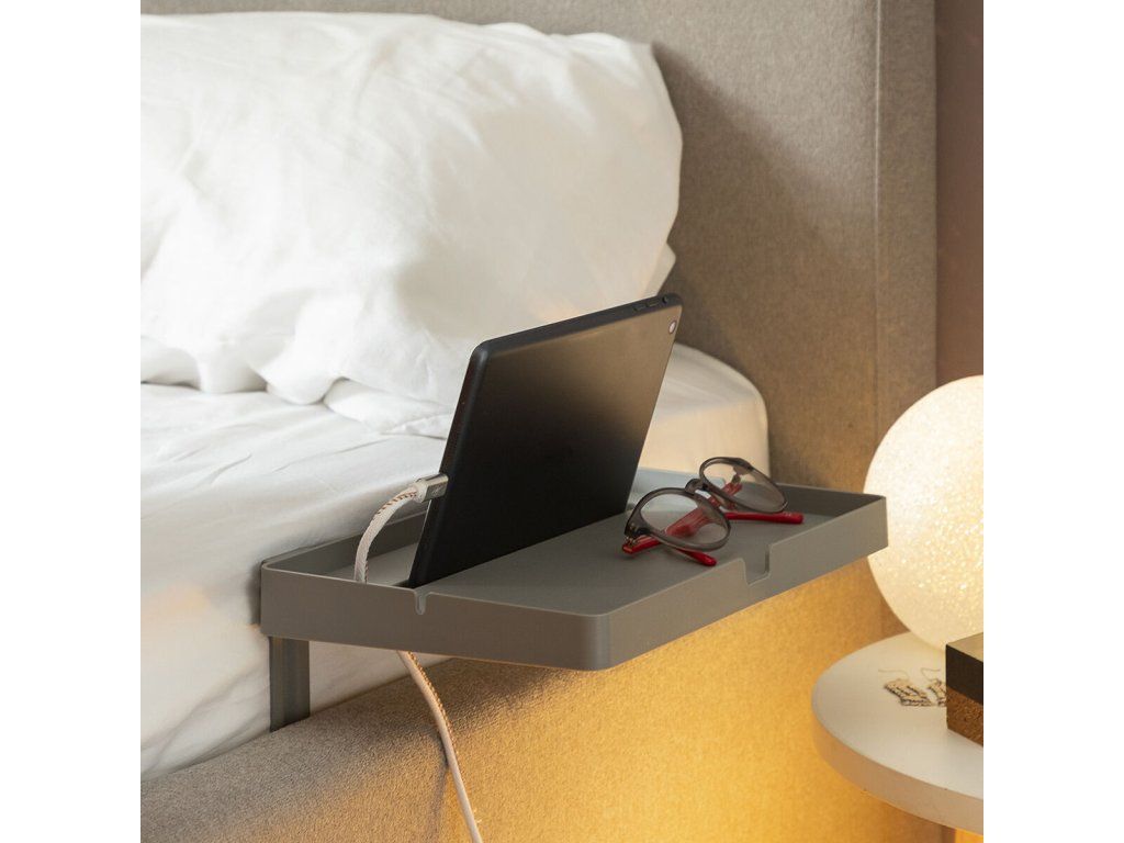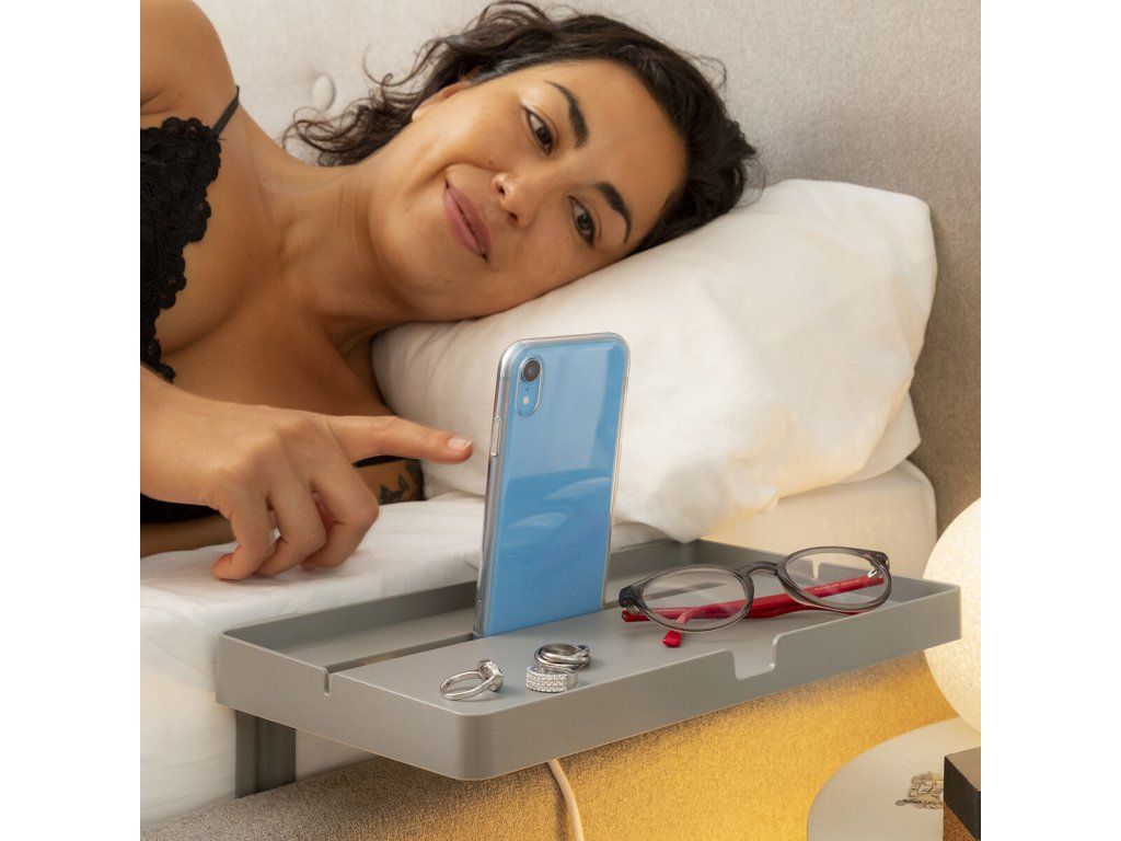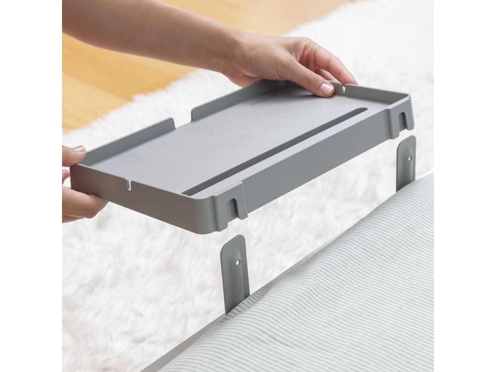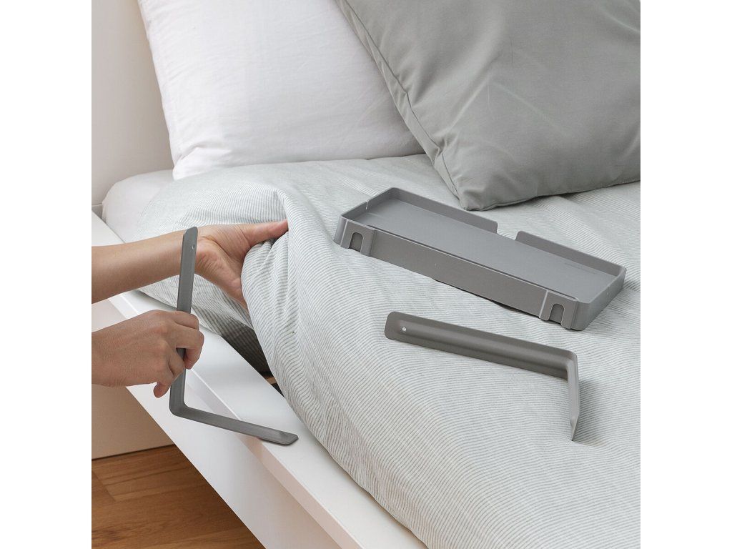 Könnyen, szerszámok használata nélkül az ágy oldalához mellékasztalként rögzíthető polc. Ideális mobil eszközök (okostelefon, tablet...) tartására, töltésére és/vagy egyéb, kényelmesen elérhető és az ágyban használható tárgyak (óra, könyv, szemüveg...) elhelyezésére. Többfunkciós, többcélú polc, amely univerzális, könnyű és hordozható kialakításának köszönhetően nagymértékben személyre szabható. Egyszerű össze- és szétszerelés, könnyen szállítható és tárolható. 2 strapabíró L alakú tartó biztosítja a polc megbízható rögzítését a matrac melletti rácsra. Nyílás mobiltelefon vagy tablet tárolására, több lyuk a tápkábelek számára. Magassága (15-20 cm) a matrac vastagságának megfelelően állítható, maximális terhelhetőség 1,5 kg-ig. Illusztrált összeszerelési útmutatót tartalmaz.- Anyag: